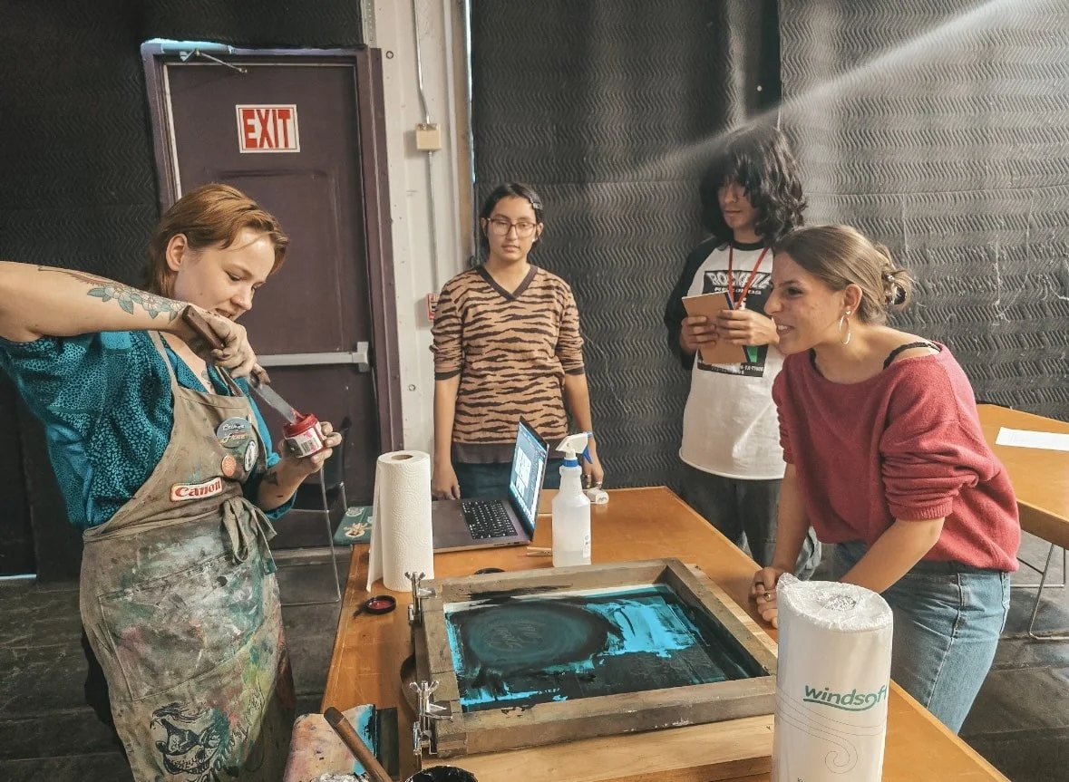 Four women in an art workshop, two observing and two demonstrating printmaking techniques using an etching press.